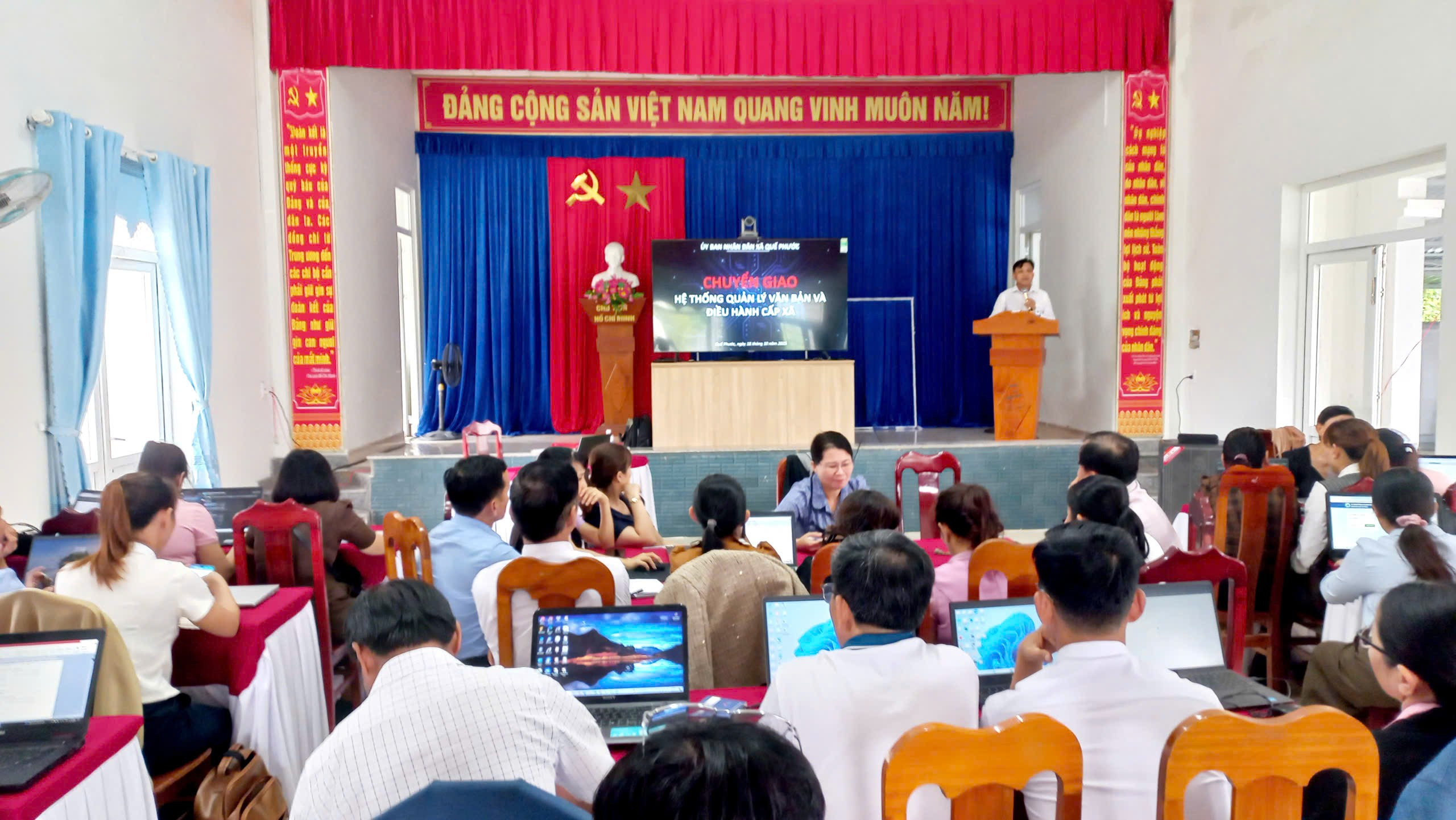 Xác định nhà trường là một trong những mắt xích quan trọng của công tác chuyển đổi số tại địa phương, buổi chiều cùng ngày các báo cáo viên của Phòng Văn hóa - Xã hội đã chuyển giao hệ thống Quản lý văn bản và điều hành cấp xã; bàn giao thiết bị, hướng dẫn cài đặt, cấu hình và sử dụng chữ ký số; ứng dụng chữ ký số Ban Cơ yếu Chính phủ trên các dịch vụ công, với sự tham gia của hơn 50 viên chức, người lao động 06 trường trên địa bàn xã.