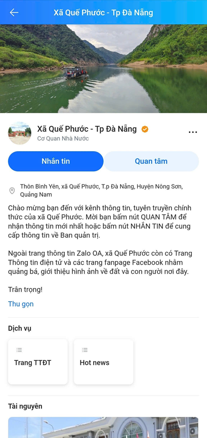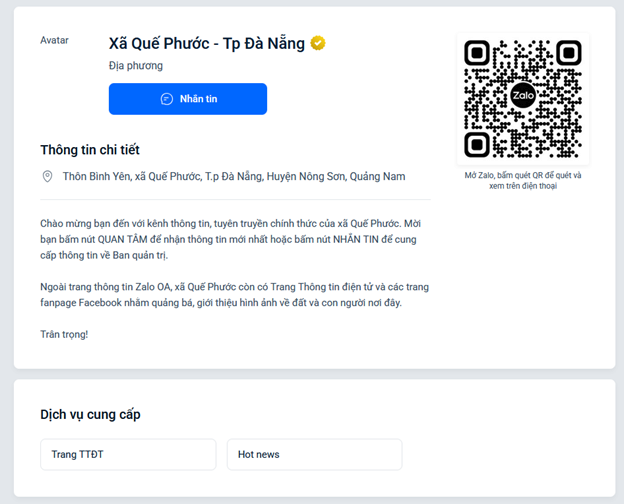 Hãy bấm nút NHẮN TIN để liên lạc, phản ánh, cung cấp thông tin về Ban Quản trị Trang Zalo OA: Xã Quế Phước - Tp Đà Nẵng hoặc bấm nút QUAN TÂM để nhận, chia sẻ thông tin mới nhất, hữu ích đến người thân, bạn bè và cộng đồng.