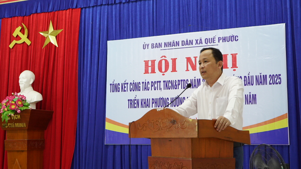 Phó Chủ tịch UBND xã Quế Phước Nguyễn Văn Lanh phát biểu tại hội nghị.