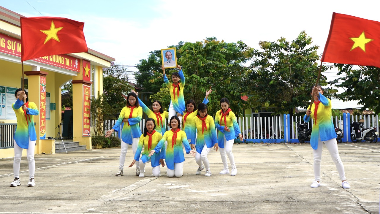 Tiết mục dân vũ với cờ Tổ quốc và ảnh Bác Hồ tại chương trình.