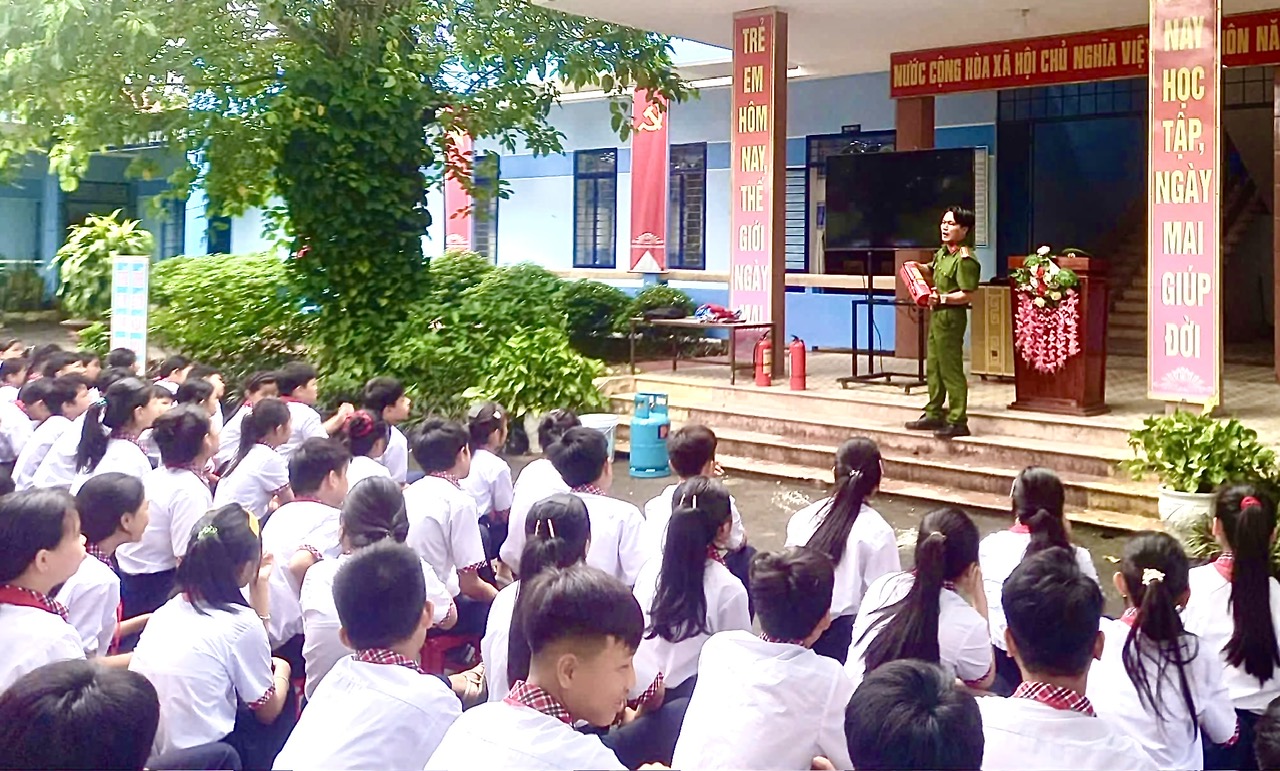 Công an xã Quế Phước tuyên truyền pháp luật cho học sinh.