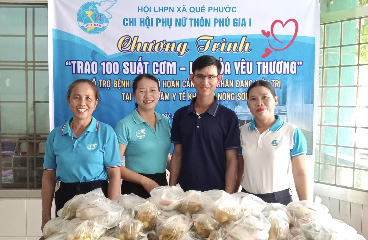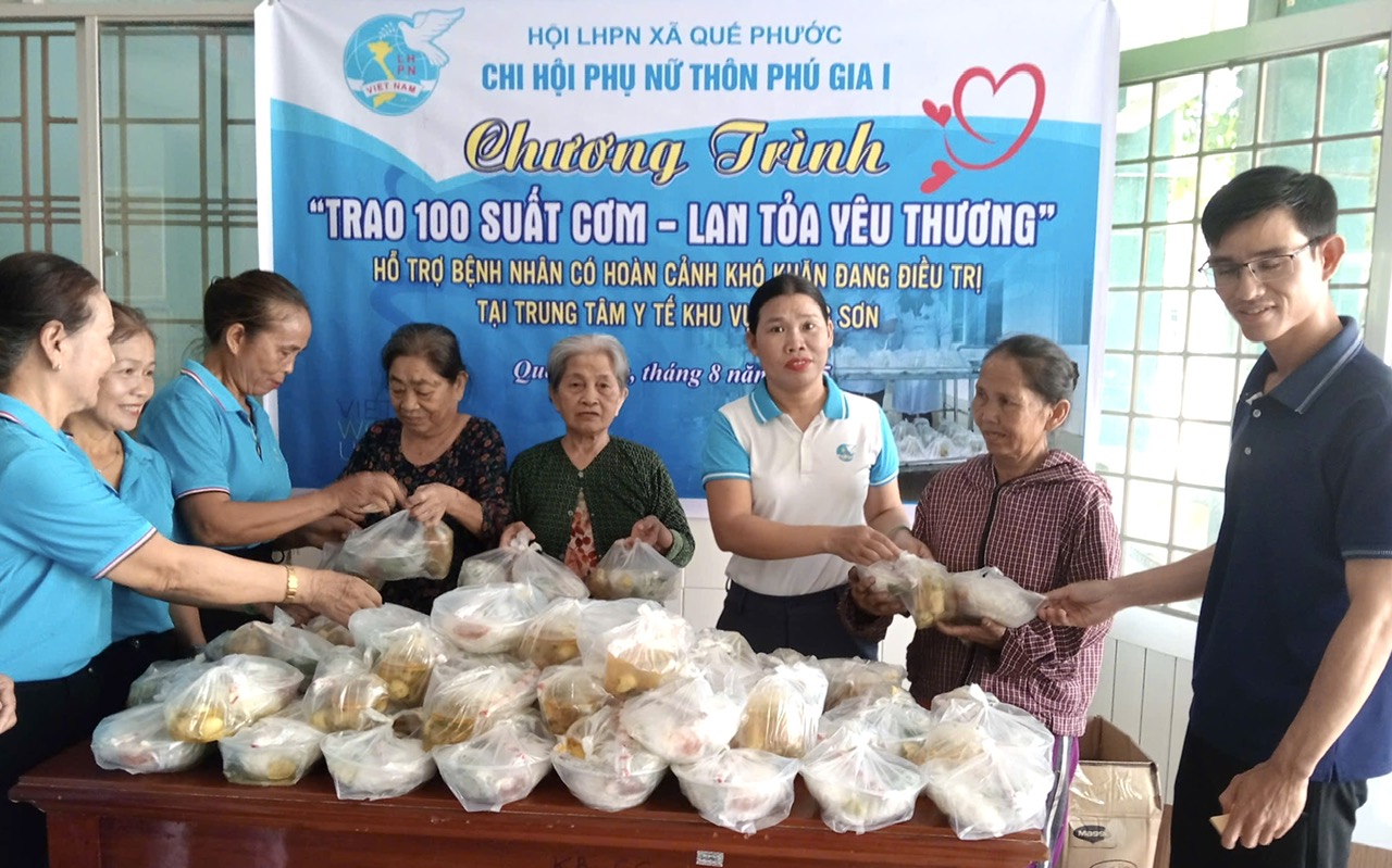Hội viên phụ nữ xã Quế Phước trao những suất cơm miễn phí đến bệnh nhân nghèo tại Trung tâm Y tế khu vực Nông Sơn.